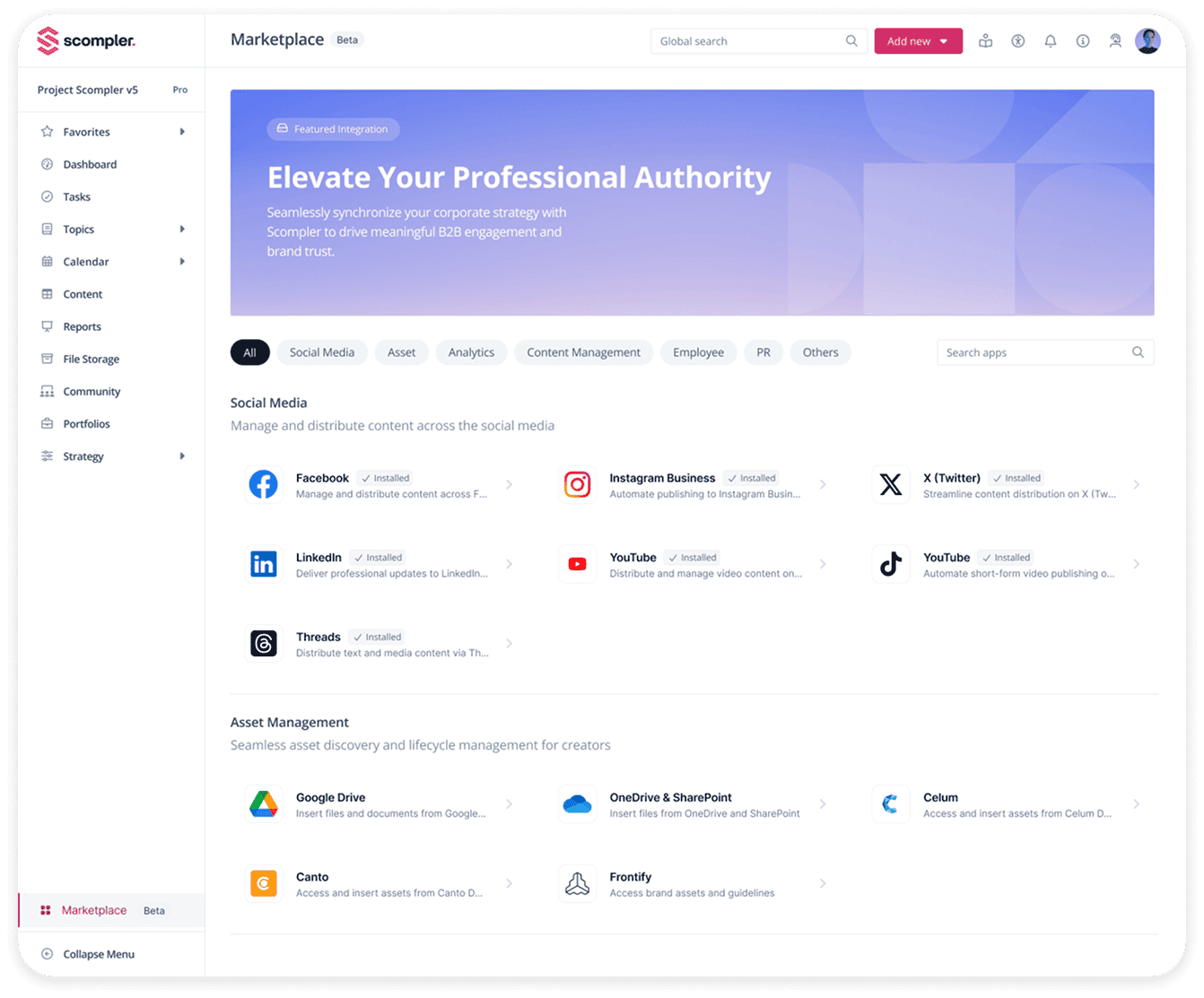 Entdecke an einem zentralen Ort alle Bausteine, deinen Kommunikations-Stack zu erweitern - nach Kategorien (wie Social Media oder PR) strukturiert und mit Beschreibungen von jeder App. So wird aus deinen Apps eine gemeinsame logische Einheit.